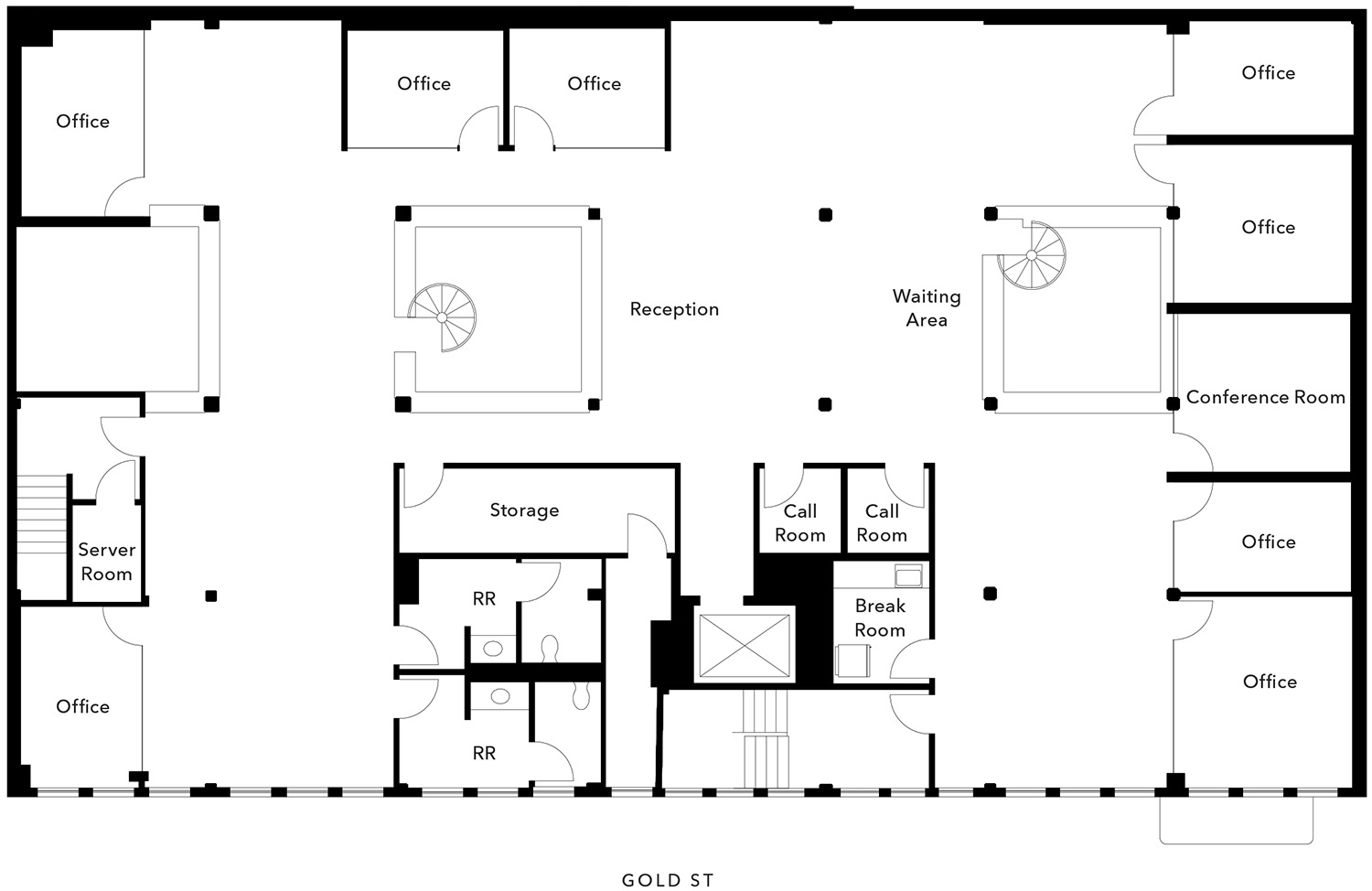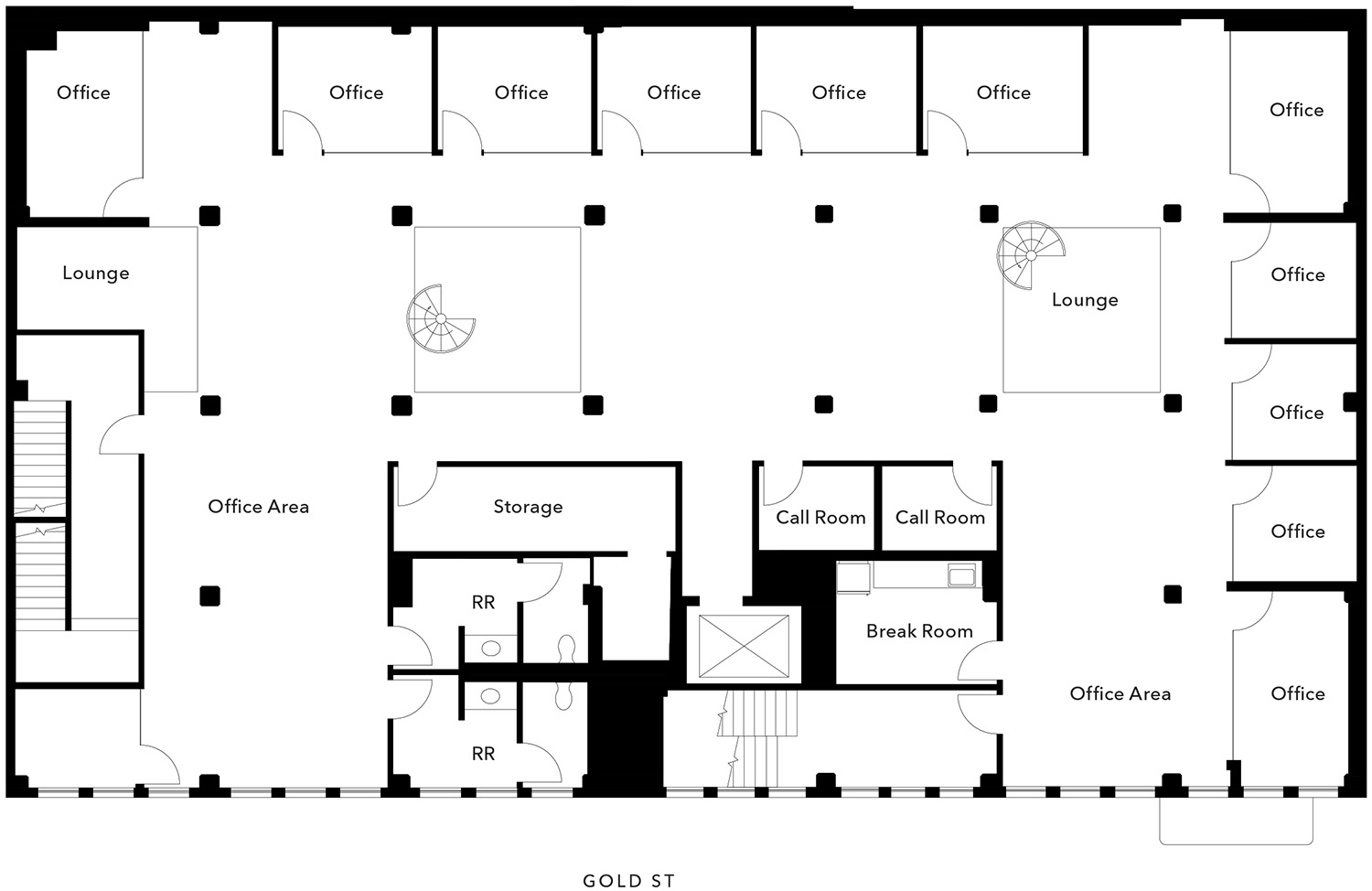 Skylights and floor cutouts provide additional light to upper floors, with extensive Gold Street window-line throughout